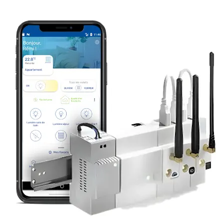 Actuellement, vos interrupteurs et vos volets roulants communiquent via des protocoles différents. Votre box Flexom fait office de passerelle : elle convertit le signal de vos interrupteurs pour transmettre l’instruction à vos volets roulants.